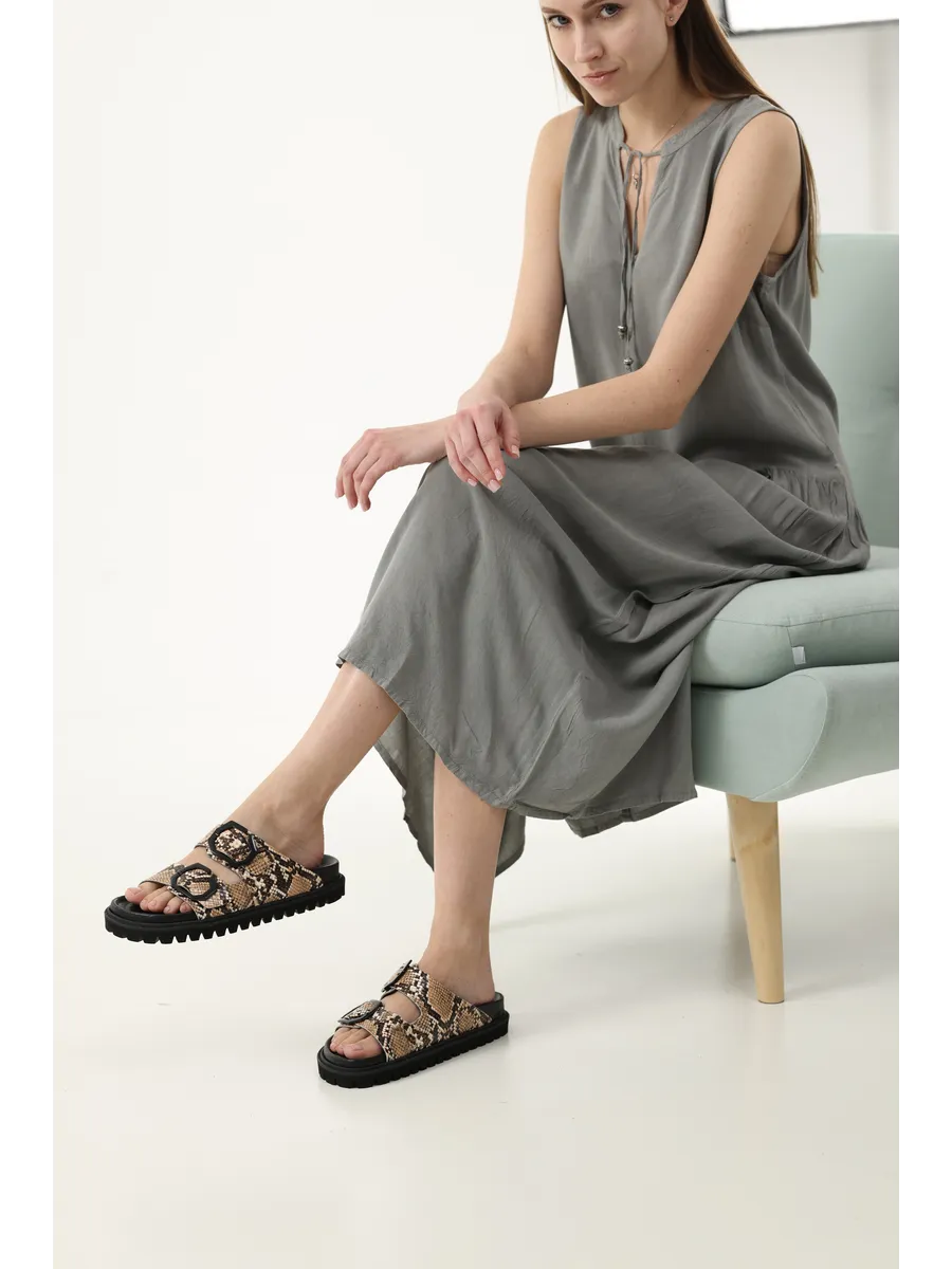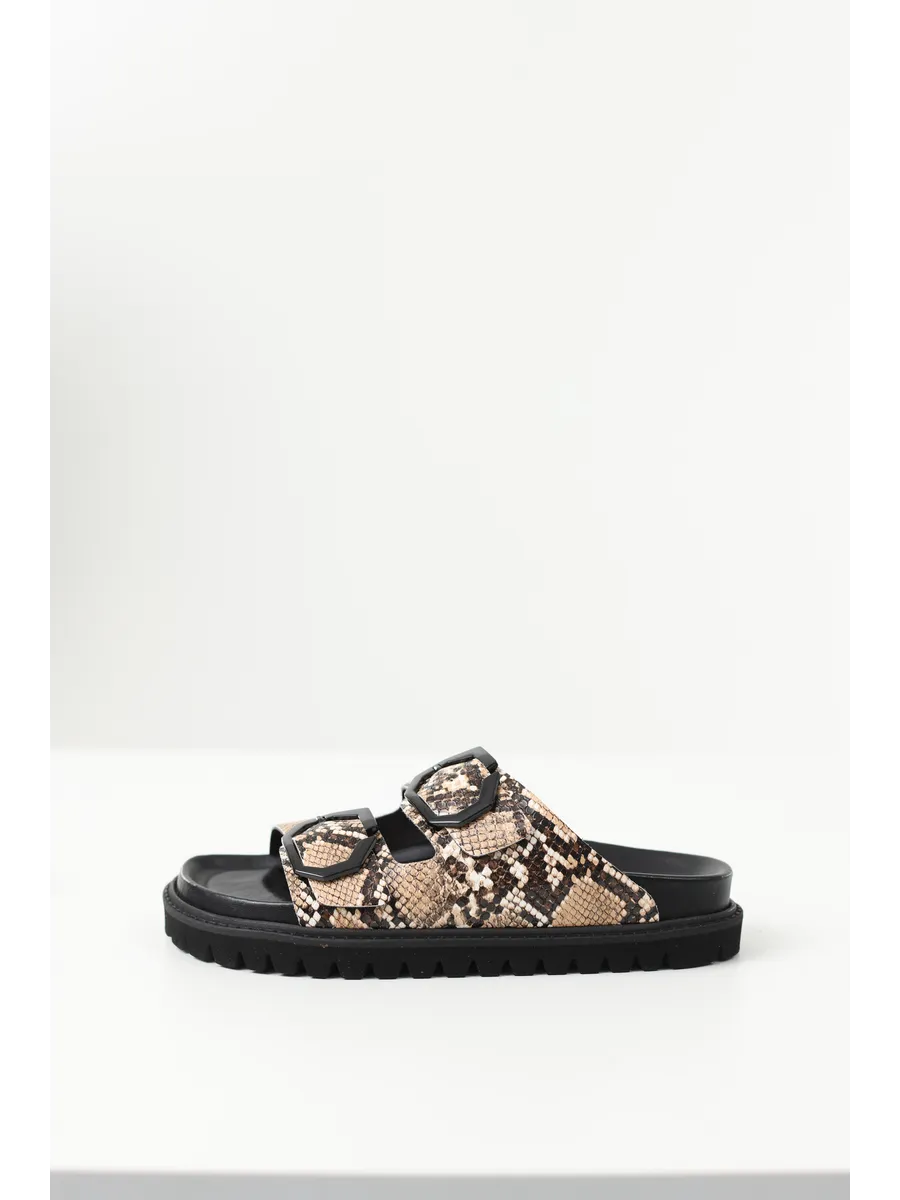 Босоножки с принтом рептилий и анатомической подошвой. Регулируется с помощью нашей эксклюзивной пряжки GENUINS. Веган, одобрен веганом PETA. Разработанная и изготовленная на наших фабриках в Эльче, качественная и долговечная обувь.